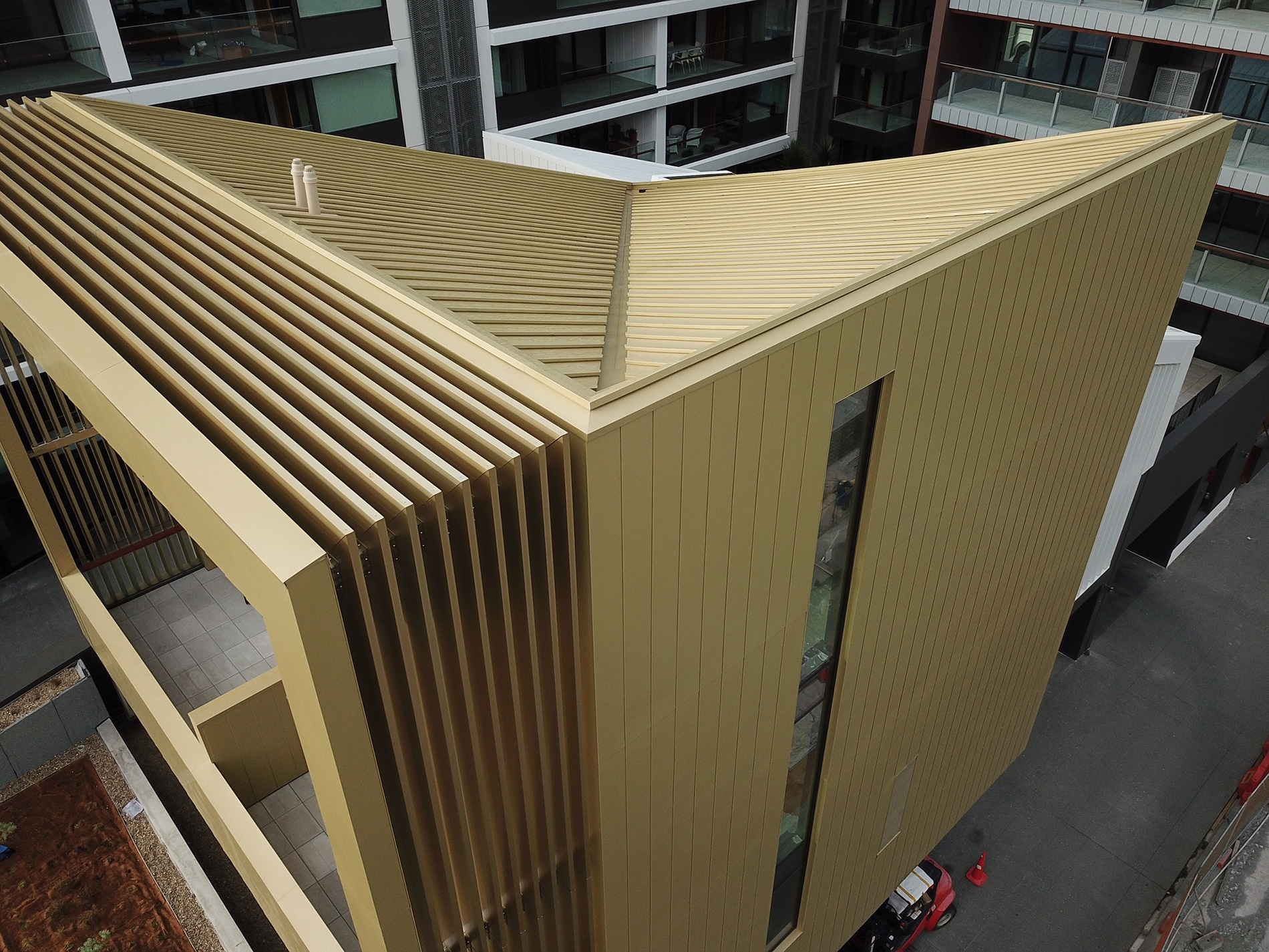 Originating in Europe this profile contributes to a pleasing wide pan tray with a distinctive wide cap. This profile is suitable for roof and wall cladding. The roll cap profile is fixed to a substrate with a concealed clip. Roll Cap profile may be completed in a range of materials including Copper, Zinc, pre-painted Aluminium and pre-painted steel.
